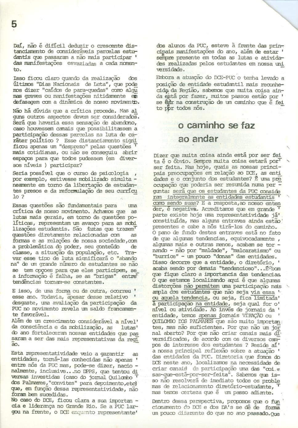 Coleção Acervo do professor Alfredo Jefferson relacionado ao DCE da PUC-Rio Código exclusivo jf0014_046 Data da criação Ano 1977 Data de criação Sáb, 01/01/1977 - 12:00 Referente a Diretório Central de Estudantes (DCE) Identificação Original Alternativa - Plataforma para o DCE Descrição Página 05. Os alunos da PUC-Rio e o movimento estudantil.