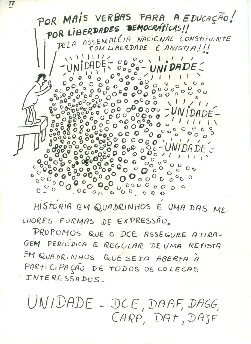 Página 12. Quadrinhos: 'Um turista na PUC'. Divulgação da chapa Unidade ao DCE.