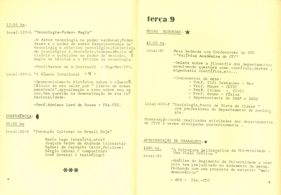 Páginas 04 e 05. Atividades de segunda e terça-feira. Mesa sobre Produção Clltural no Brasil Hoje, com Mário Lago, Sérgio Cabral, Joaquim Pedro de Andrade e José Arrabal.