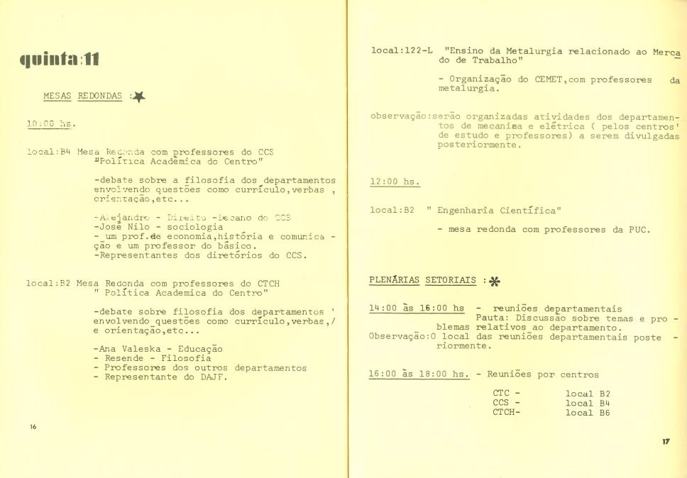 Páginas 16 e 17. Atividades de quinta-feira. Mesas-redondas e plenárias setoriais (CTC, CCS e CTCH), nos auditórios B2, B4 e B6.