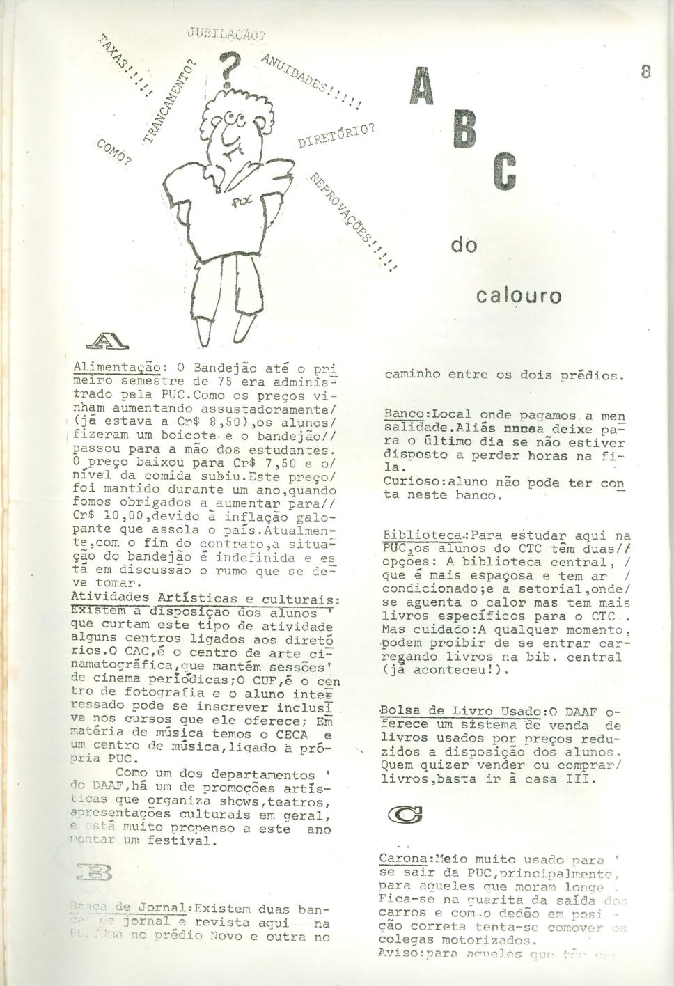 Página 08. ABC do Calouro. Sobre alimentação no campus, cultura, banca de jornal, agência bancária, biblioteca, carona.
