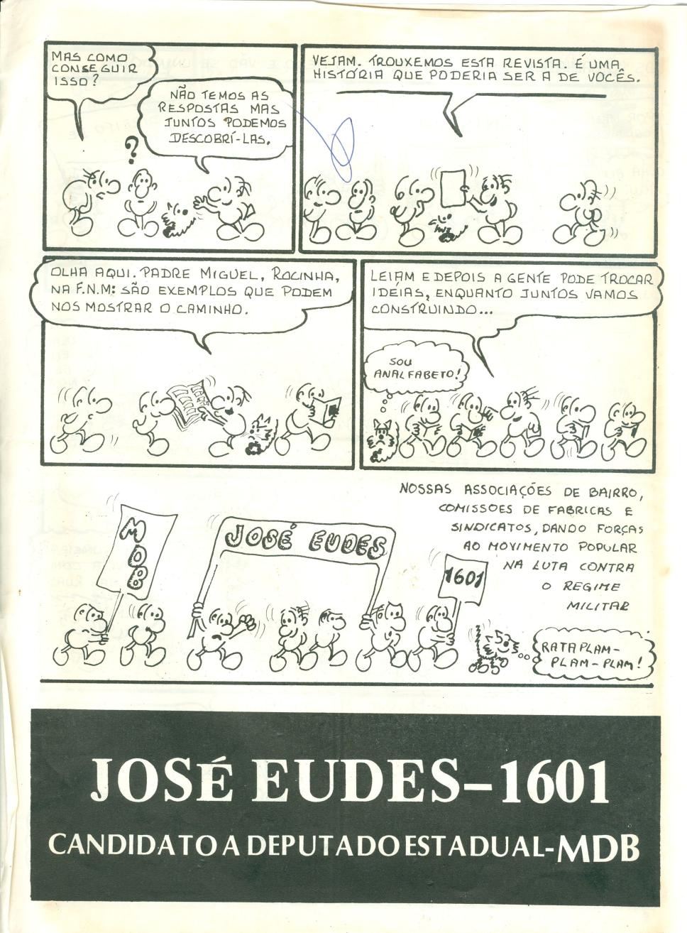 Propaganda eleitoral do candidato a deputado estadual José Eudes, do MDB, sob a forma de quadrinhos.