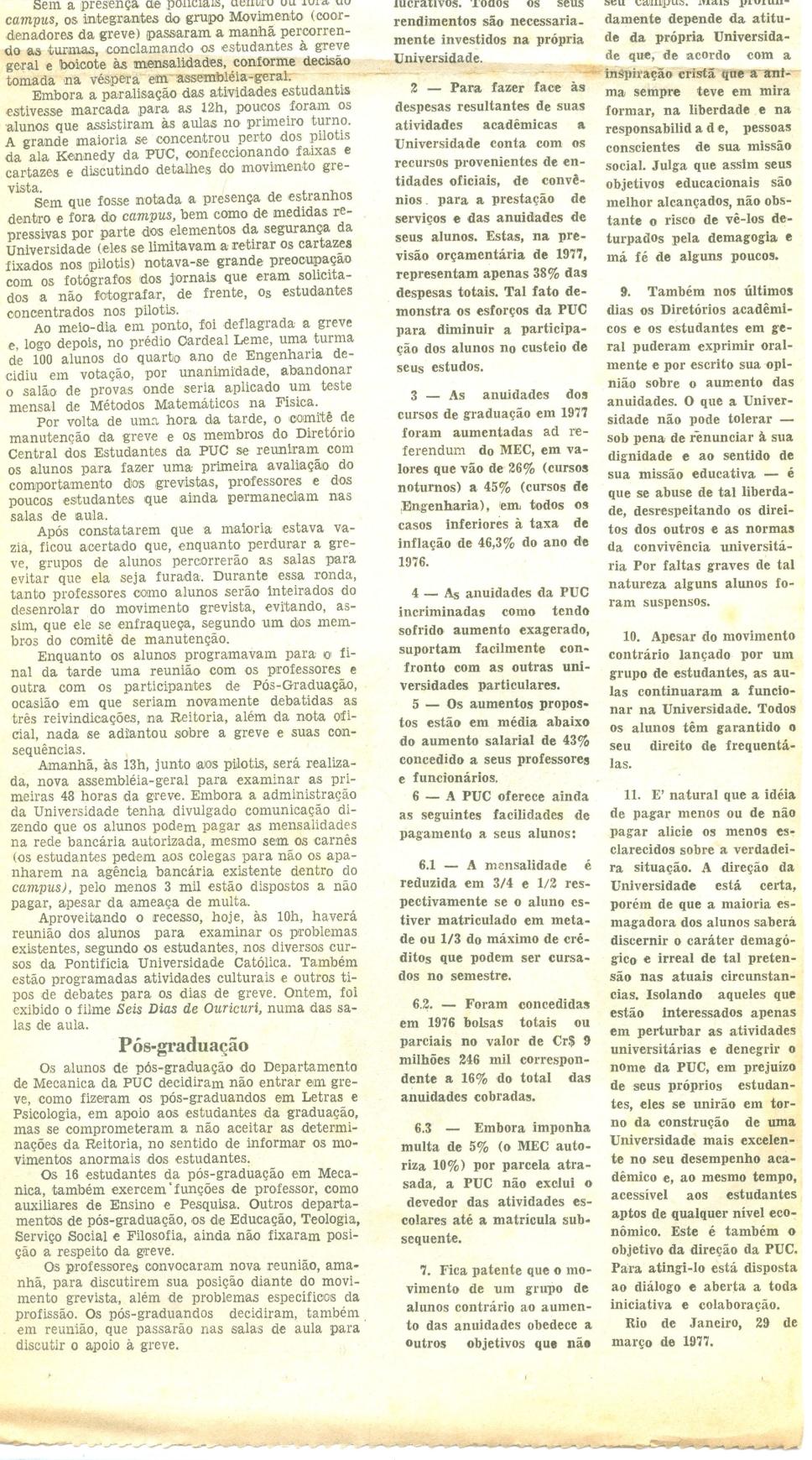 (cont.) Matéria do Jornal do Brasil sobre a greve organizada por alunos da PUC-Rio e os motivos das decisões da Reitoria.