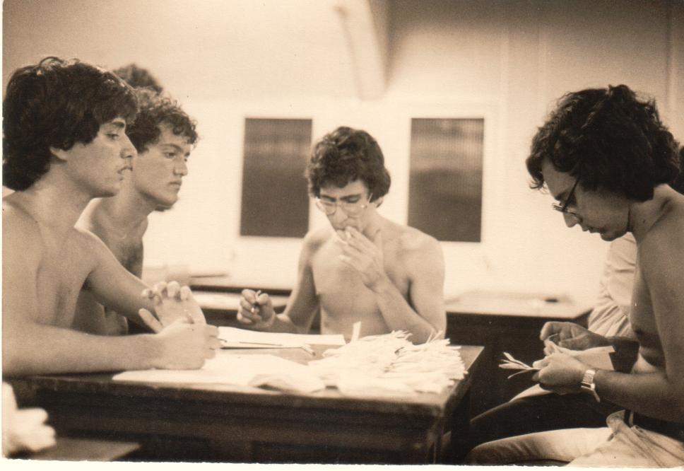 Mesa de apuração de votos. Representantes das chapas sem camisa por conta do calor.