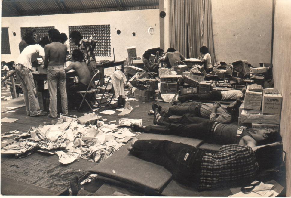 Mesas de apuração dos votos. Alunos dormem em meio às caixas de papelão nos colchonetes do ginásio devido ao cansaço da virada de noite.