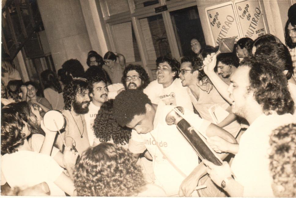 Alunos comemoram o resultado das eleições estudantis. Cartaz chapa Mutirão. Camisetas chapa Unidade.