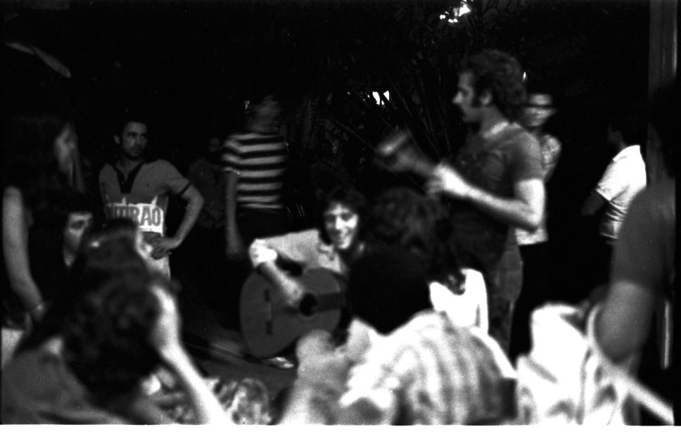 Alunos em frente ao Ginásio aguardam o resultado da apuração. Alguém resolve tocar violão.