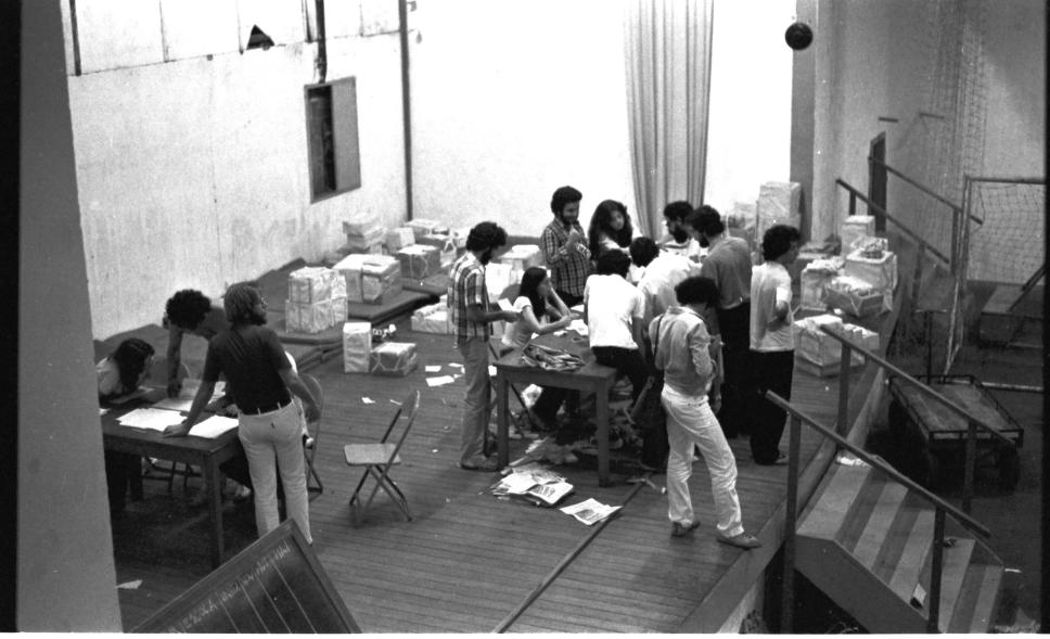 Palco do ginásio lotado com caixas de papelão e pacotes de votos.