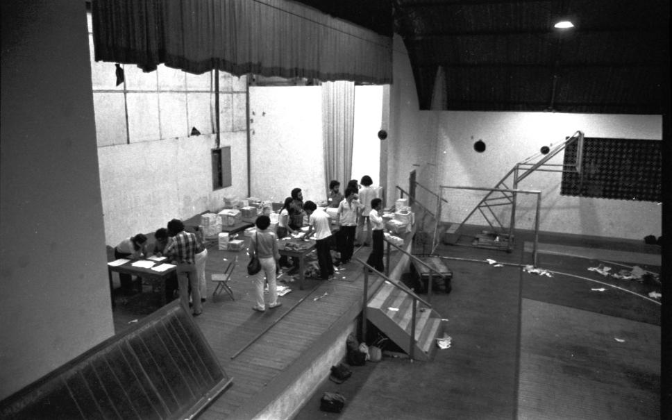Palco do ginásio lotado com caixas de papelão que transportaram os votos.