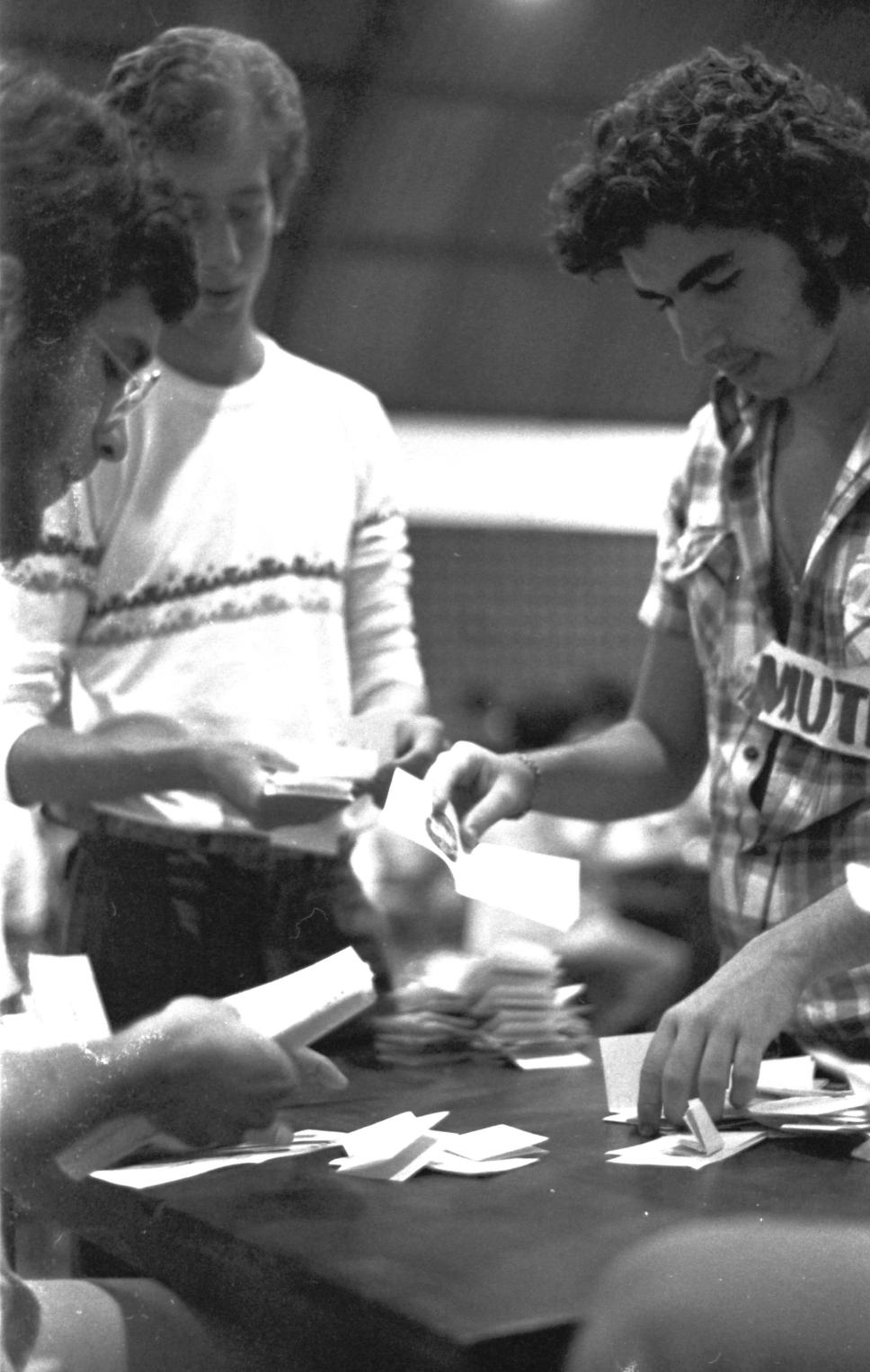 Mesa de apuração. Mesário com identificação da chapa Mutirão.