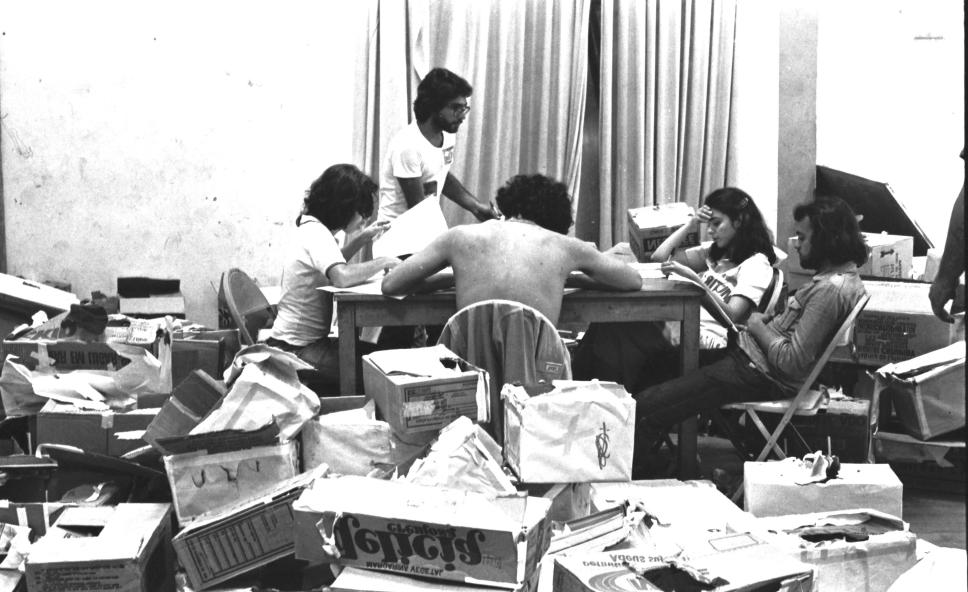 Equipe que organizava a apuração, no palco do Ginásio, em meio às caixas que transportaram as cédulas.