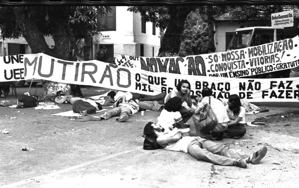 Estudantes aguardam o final da apuração em frente ao Ginásio. Faixas das chapas Novação e Mutirão.