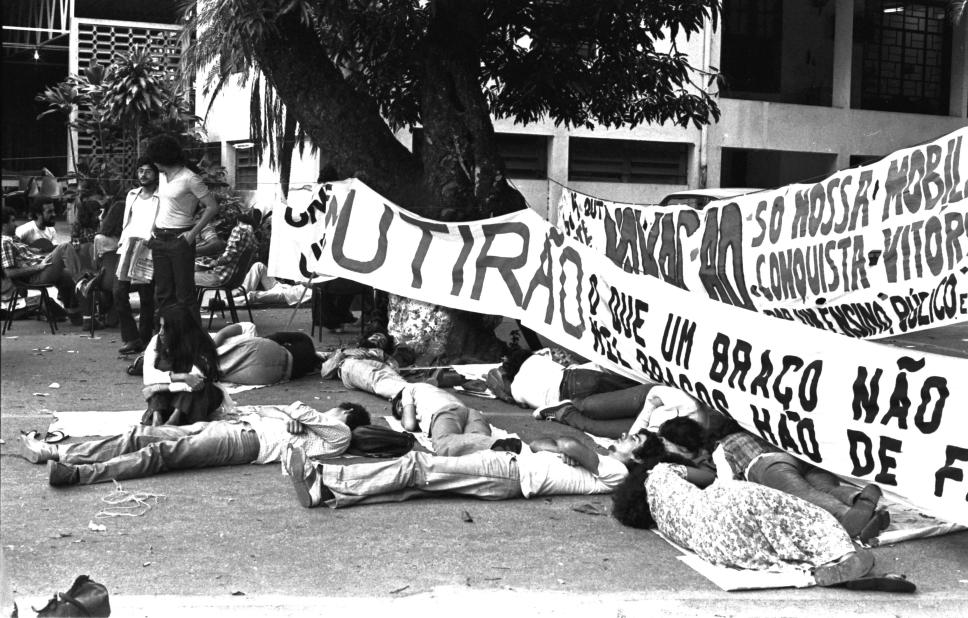 Estudantes, deitados no chão, exaustos pela virada de noite, aguardam o final da apuração em frente ao Ginásio. Faixas das chapas Novação e Mutirão.