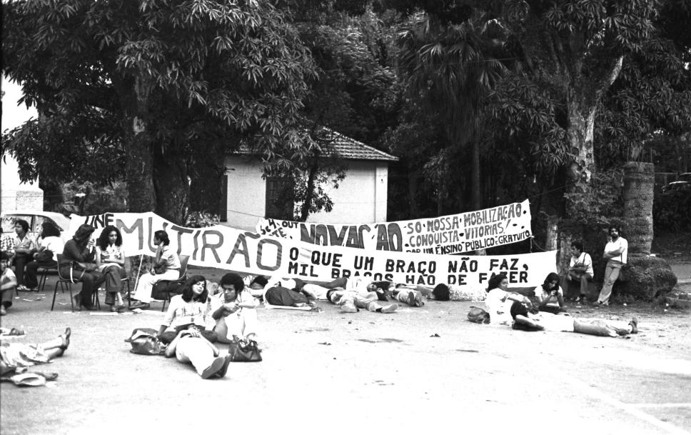 Estudantes aguardam o final da apuração em frente ao Ginásio. Faixas das chapas Novação e Mutirão.
