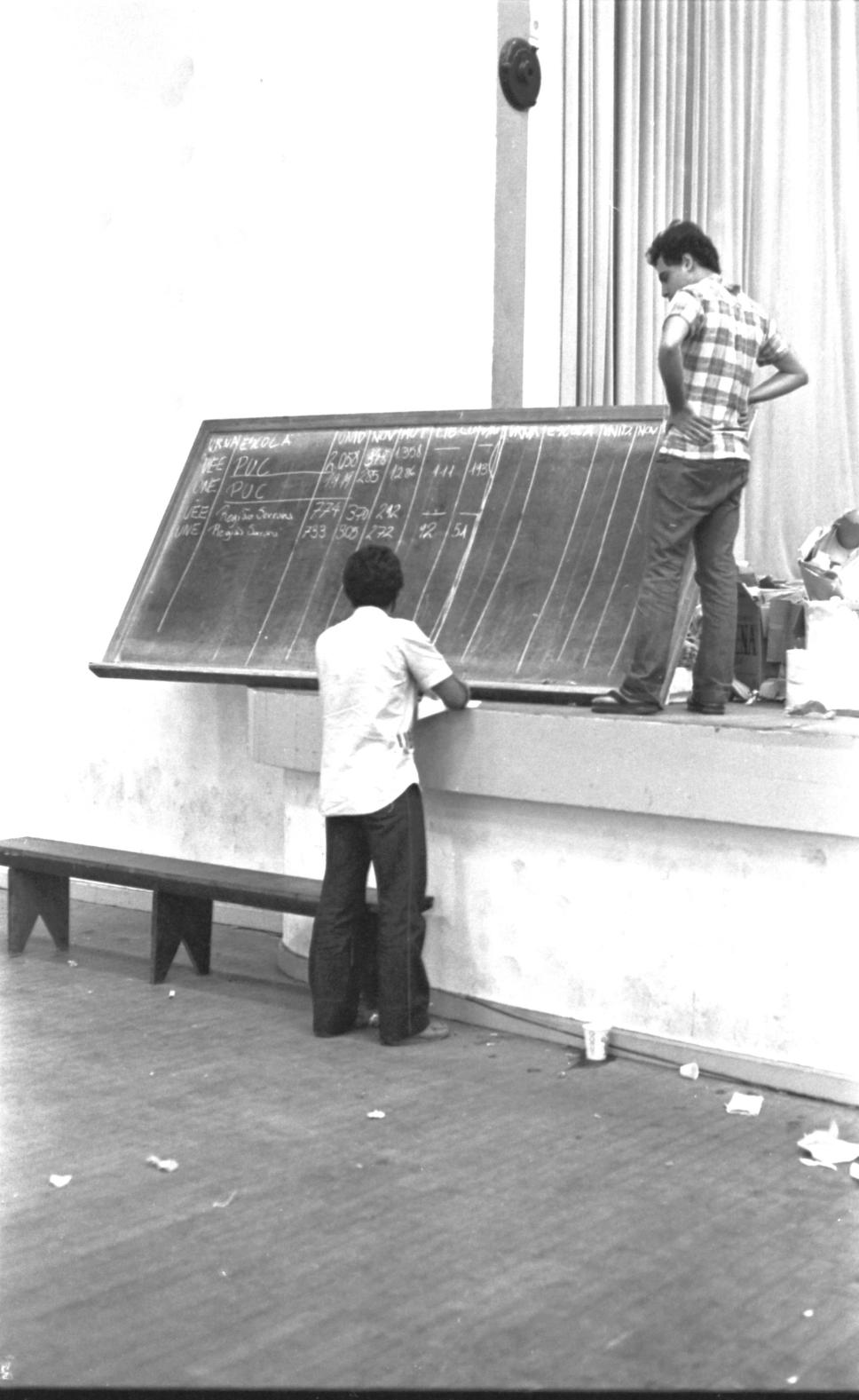 Quadro de giz com anotações sobre as apurações por região do estado.
