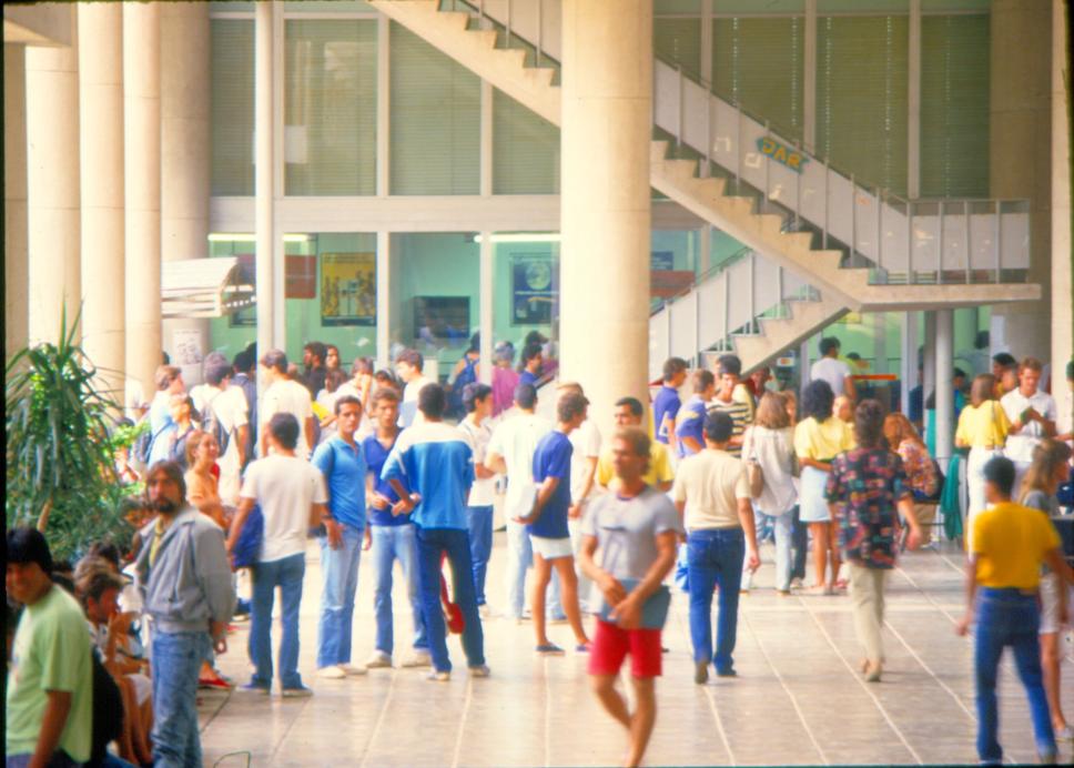 A circulação de alunos, funcionários e professores nos pilotis do Edifício da Amizade.