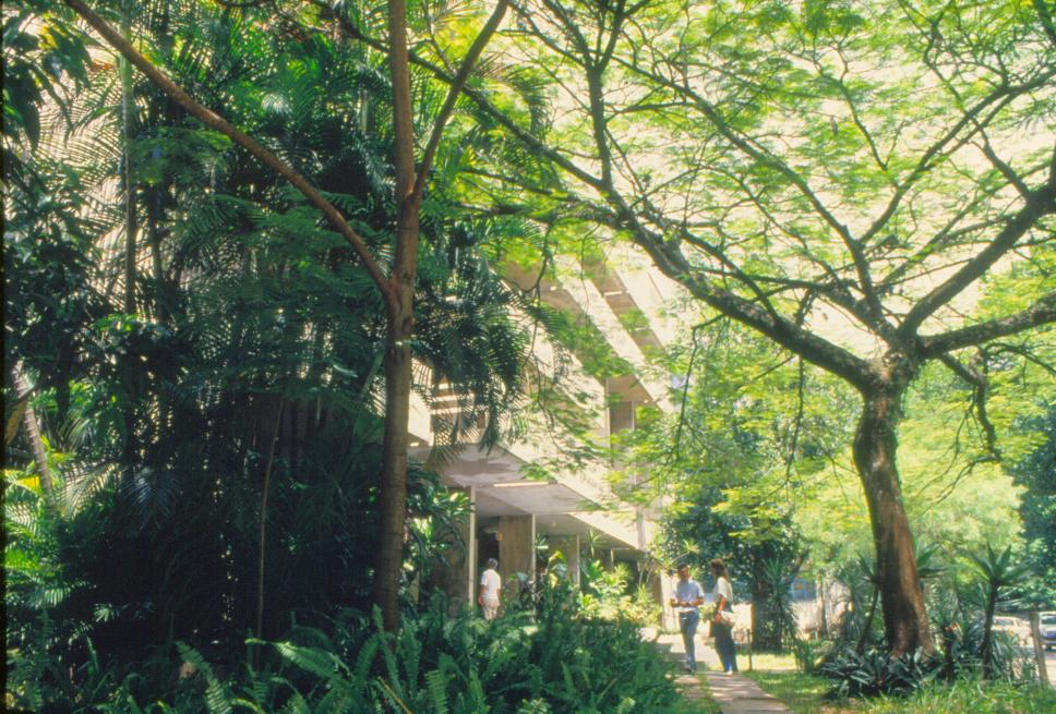 Vista da fachada do RDC. Pessoas conversam em frente ao prédio.