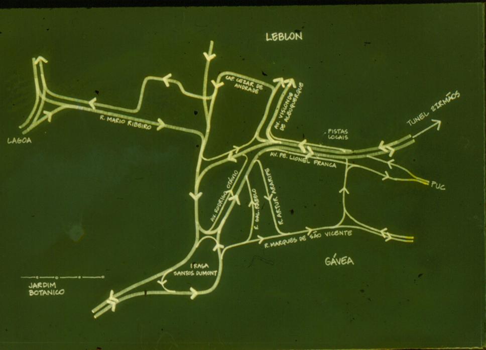 Mapa de ruas / avenidas que cortam a Gávea. Aparecem as ligações entre os bairros da Gávea, do Jardim Botânico e do Leblon, além de indicar a presença do túnel Dois Irmãos e a Auto-estrada Lagoa-Barra.
