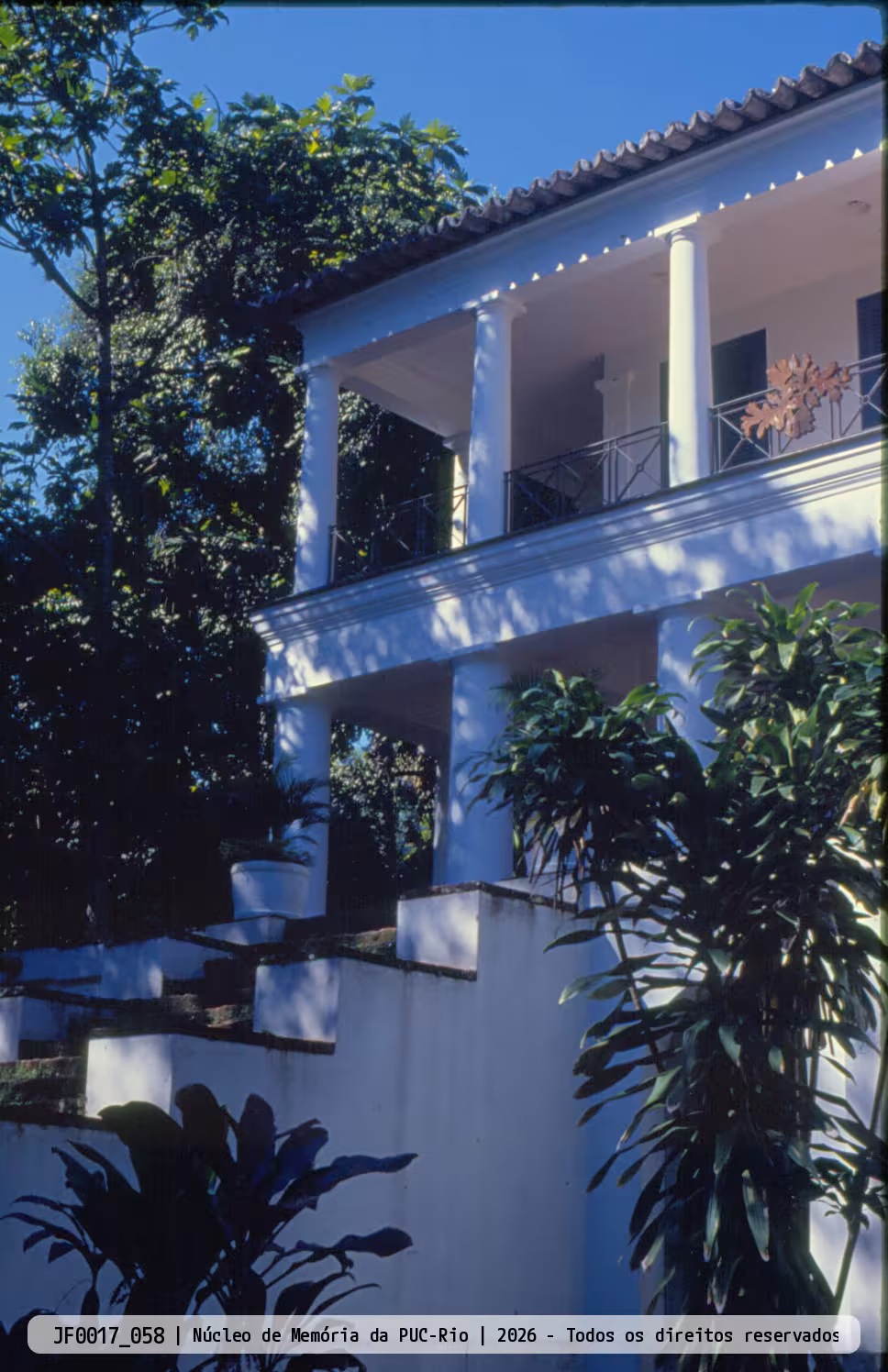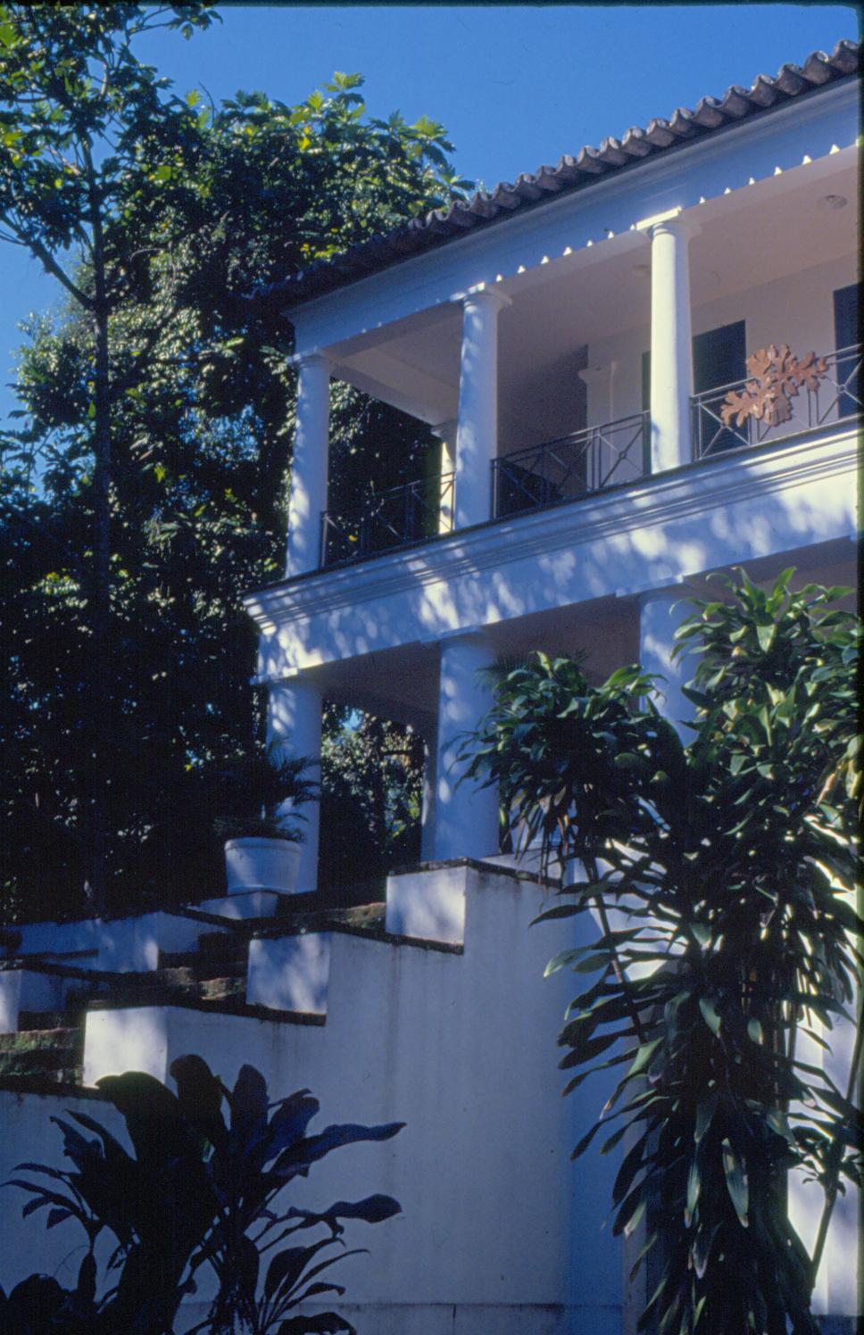 Fachada do Solar Grandjean de Montigny, escada, mata, árvores.