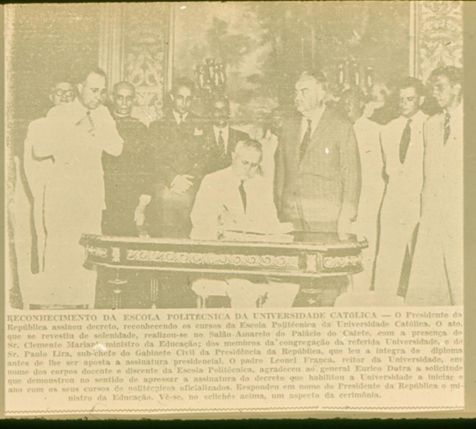 Reconhecimento da Escola Politécnica da Universidade Católica, que ocorreu em 11 de setembro de 1952, no Palácio do Catete. Matéria de jornal informa o reconhecimento.