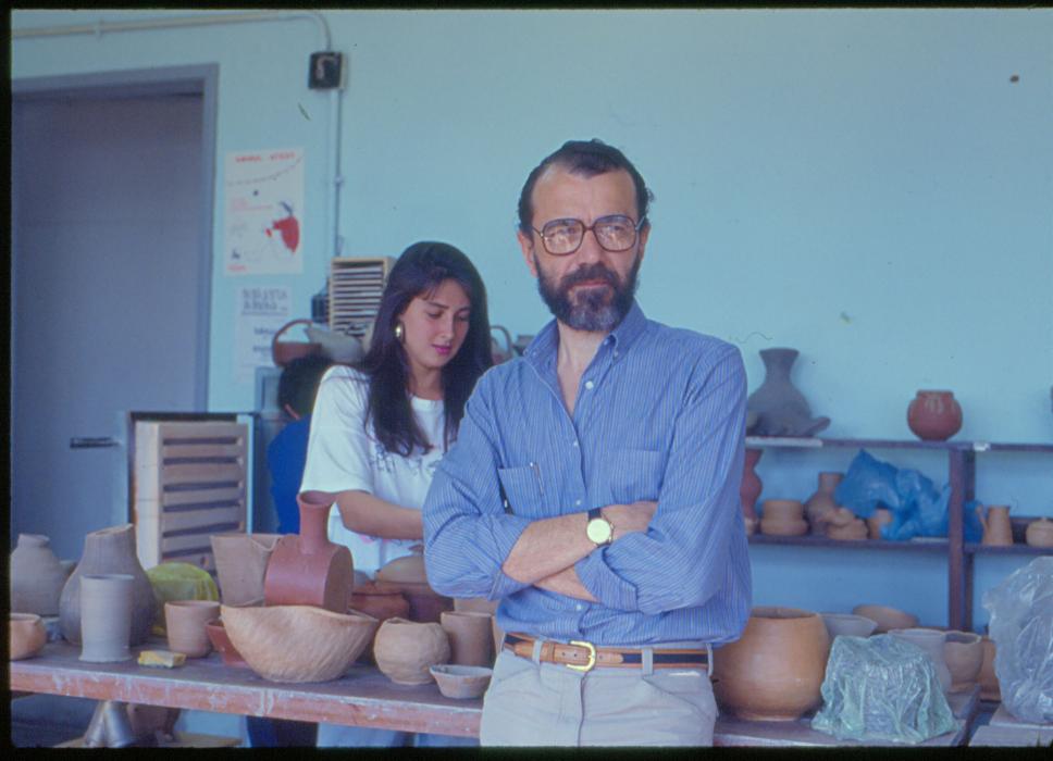 O Professor Elmer Correa Barbosa, do Departamento de Artes, e alunos em aula de cerâmica.