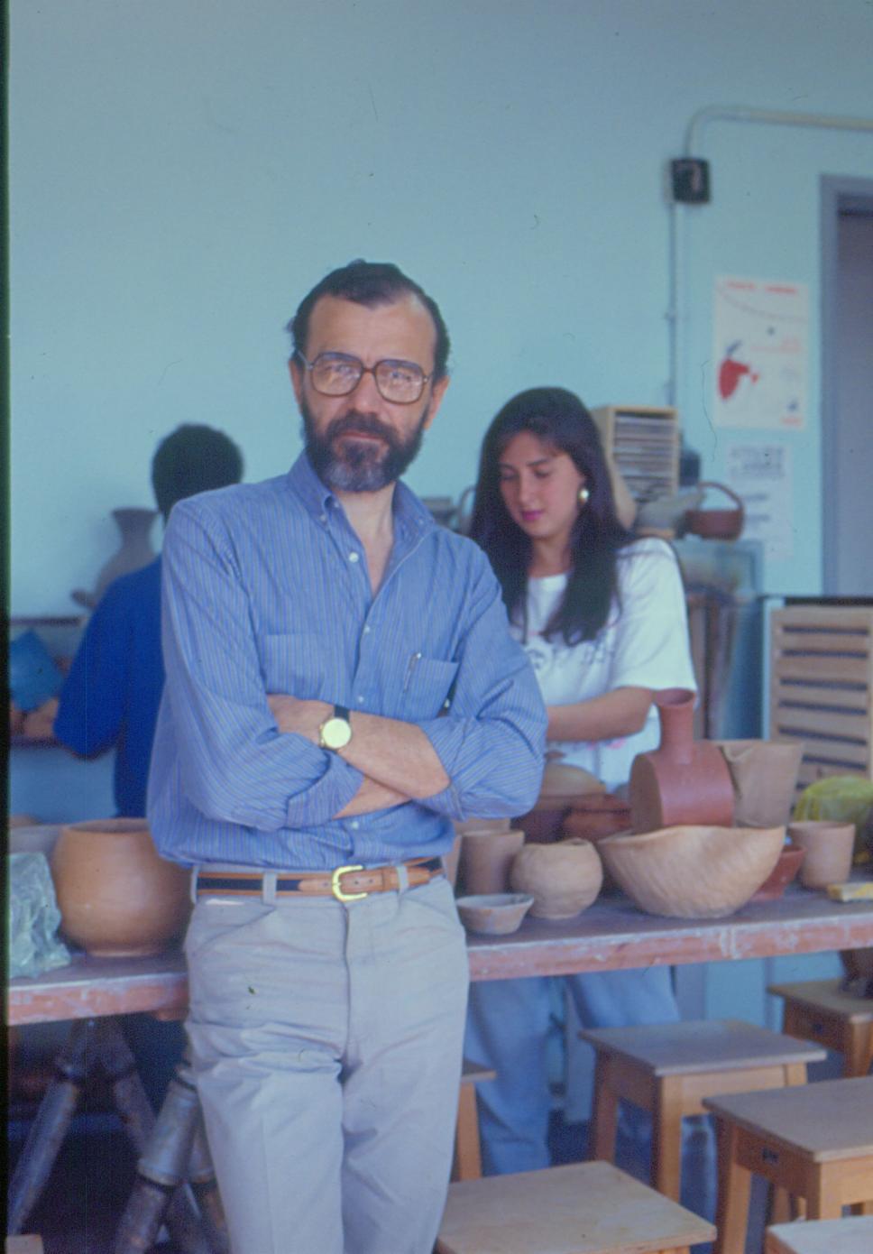 O Professor Elmer Correa Barbosa, do Departamento de Artes, e alunos em aula de cerâmica.
