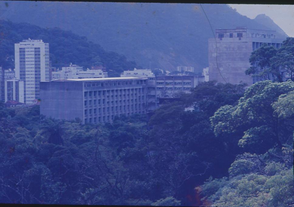 Vista do alto do campus da PUC-Rio. Fachada do Edifício da Amizade e parte do Edifício Cardeal Leme.
