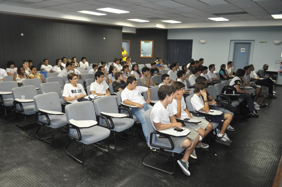 Alunos pré-vestibulandos visitantes assistem a apresentação do curso de Engenharia de Controle e Automação.