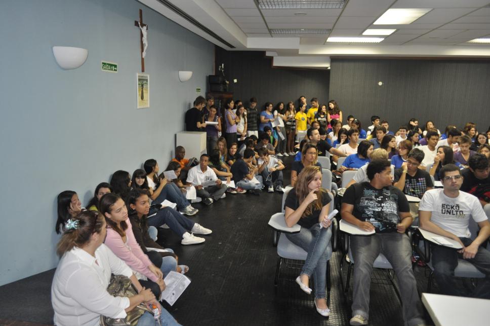 Alunos pré-vestibulandos visitantes assistindo à palestra O diferencial da PUC-Rio - Vestibular e ENEM.