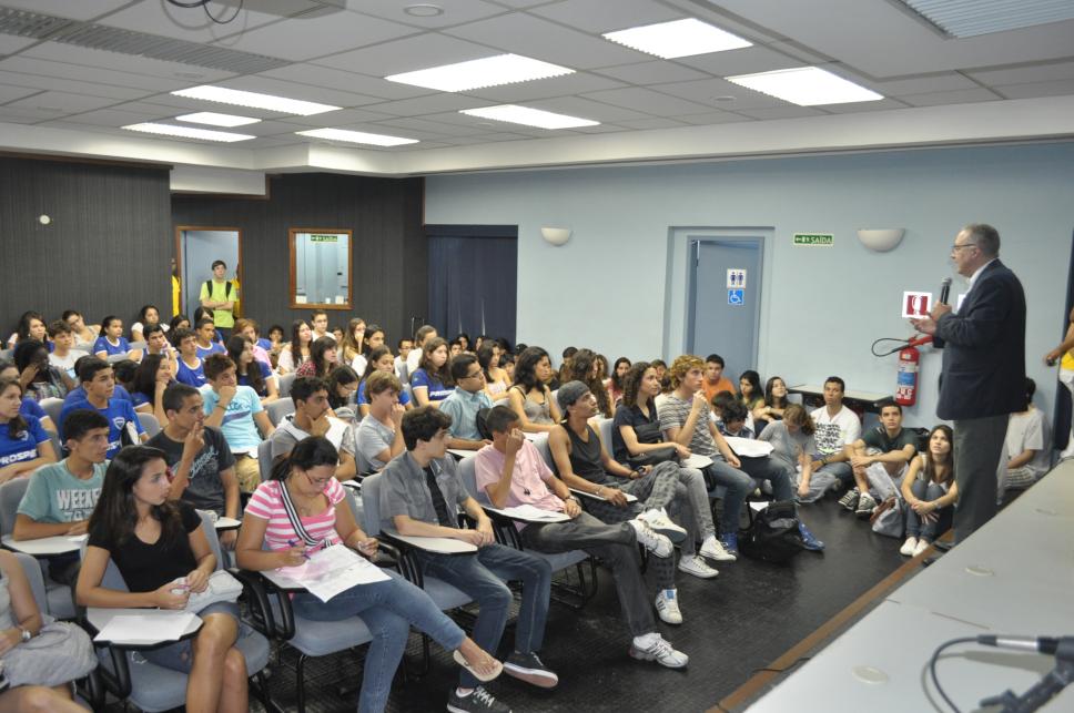 Apresentação pelo Reitor pe. Josafá S.J. da palestra O diferencial da PUC-Rio - Vestibular e ENEM, para alunos pré-vestibulandos visitantes.