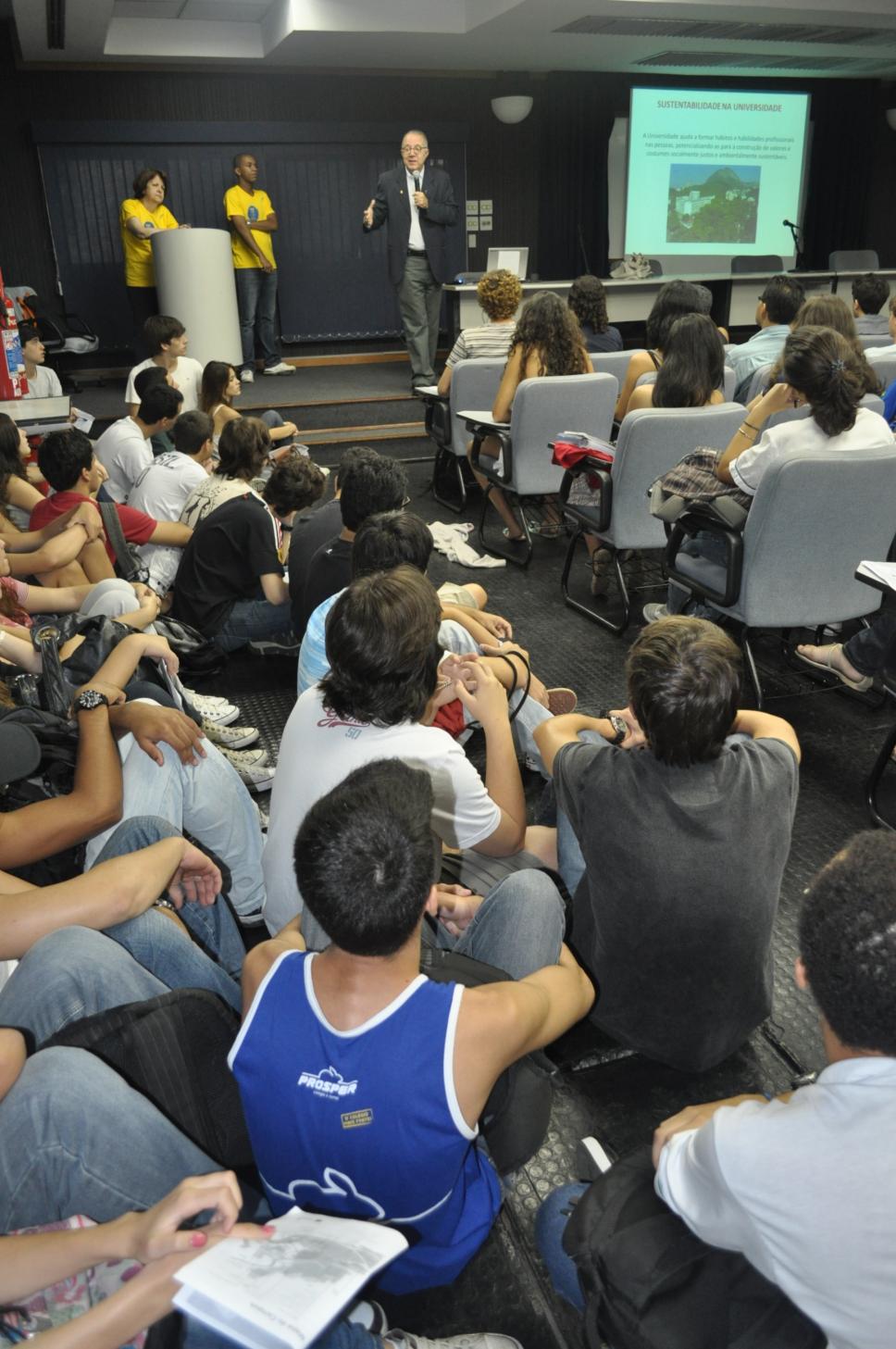 Apresentação pelo Reitor pe. Josafá S.J. da palestra O diferencial da PUC-Rio - Vestibular e ENEM, para alunos pré-vestibulandos visitantes.