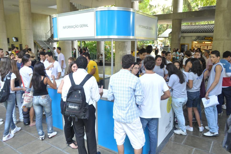 Visitantes no evento PUC por Um Dia, em frente ao stand de Informação Geral.