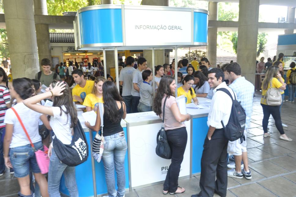 Visitantes no evento PUC por Um Dia, em frente ao stand de Informação Geral.