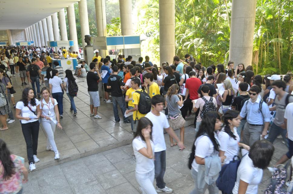 Visitantes nos pilotis no evento PUC por Um Dia. Stands de informações.