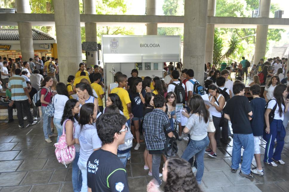 Visitantes nos pilotis no evento PUC por Um Dia, em frente ao stand da Biologia.