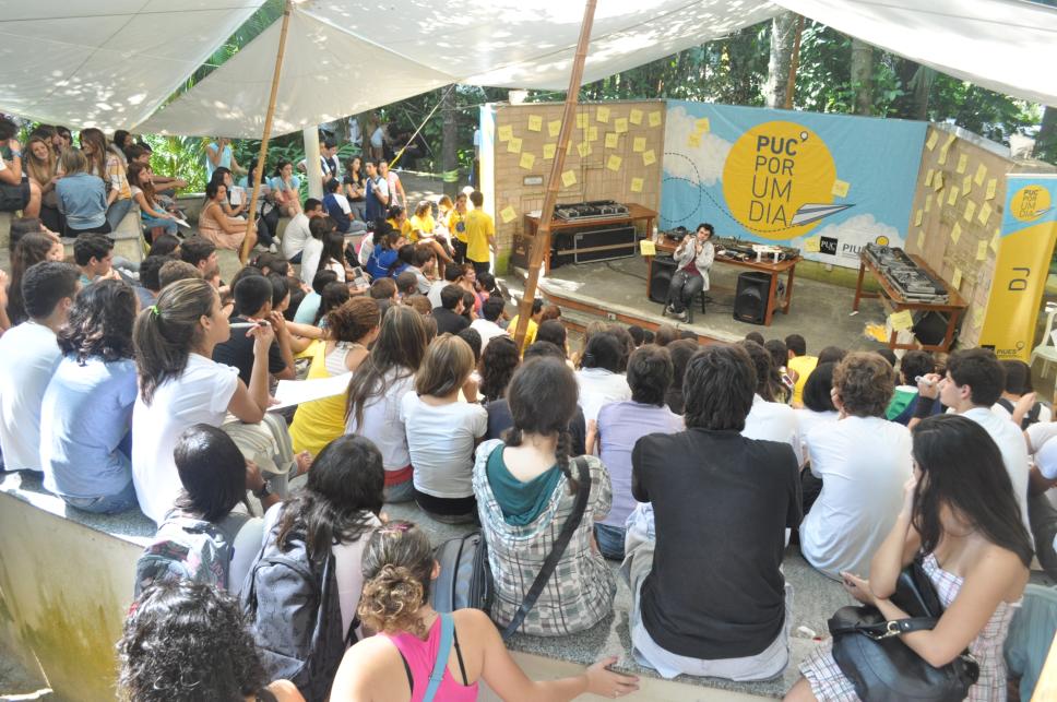 Estudantes no evento PUC por um Dia, assistindo a uma palestra.