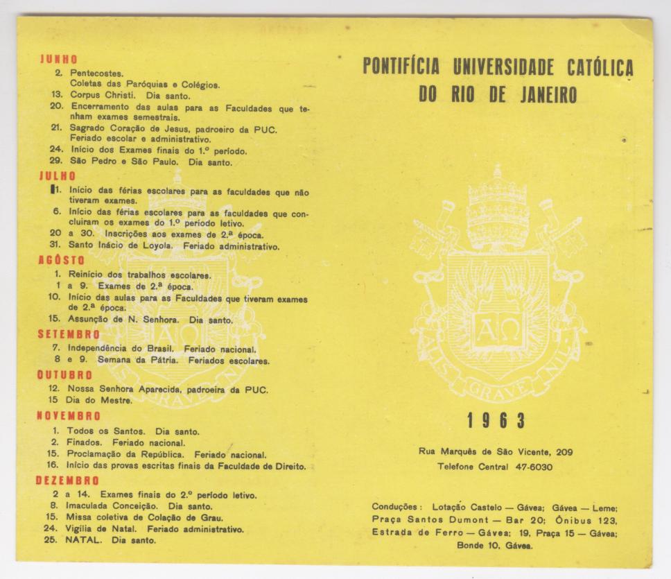 Calendário acadêmico da PUC-Rio, contendo os meses do segundo semestre de 1963.