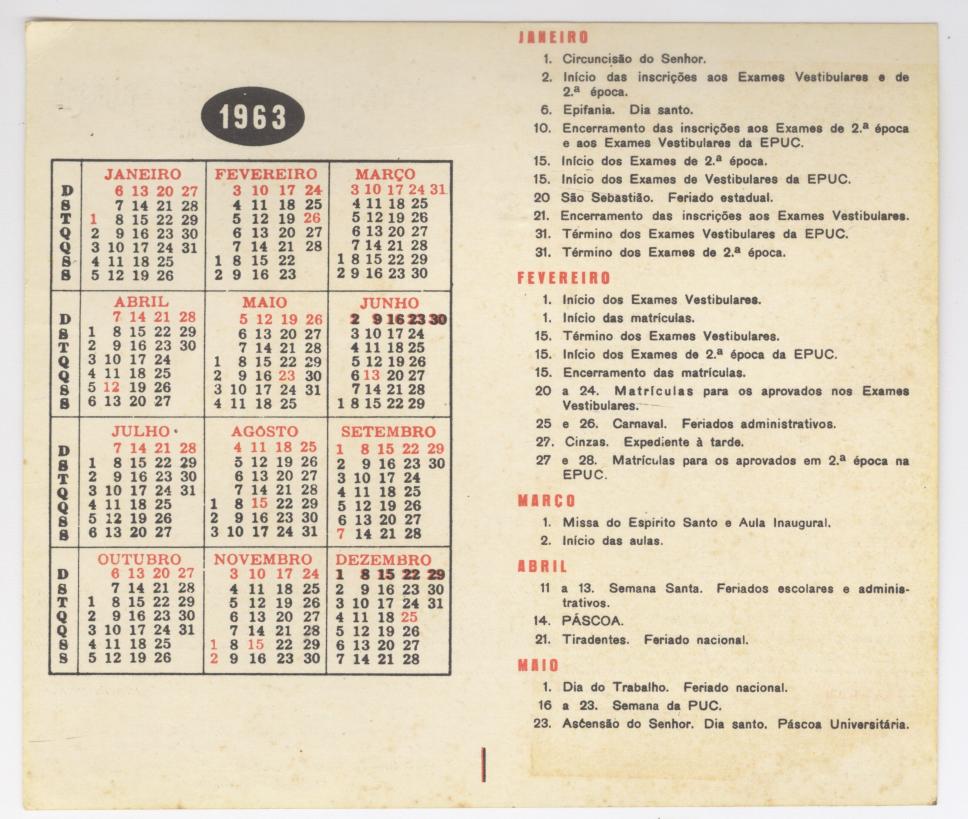 Calendário acadêmico da PUC-Rio, contendo os meses do primeiro semestre de 1963.