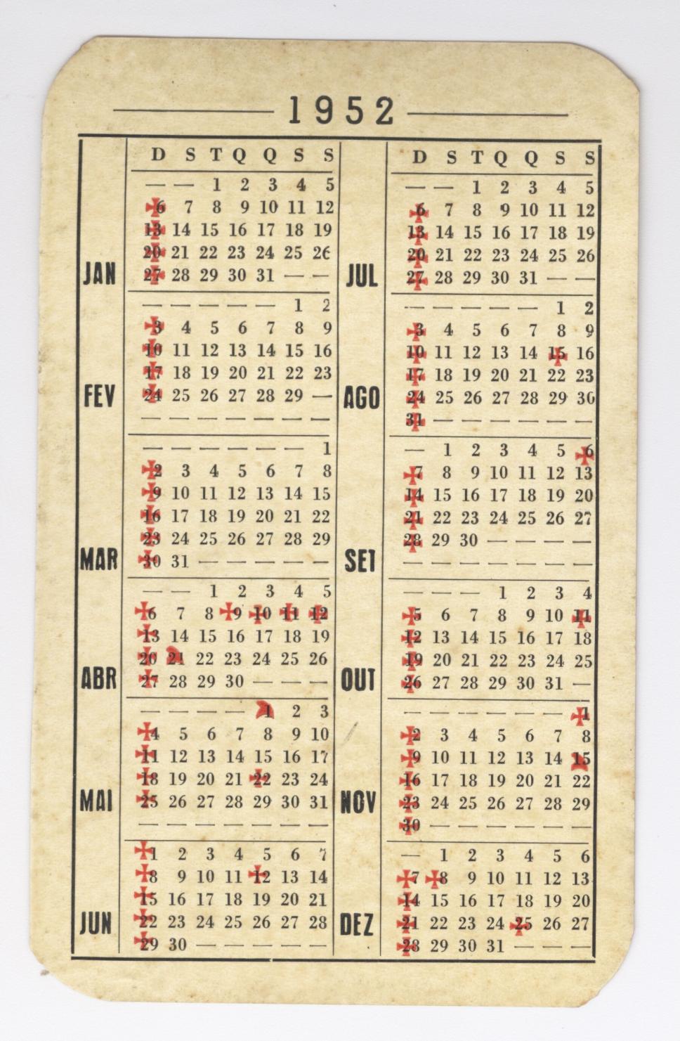 Calendário da PUC-Rio, contendo todos os meses de 1952.
