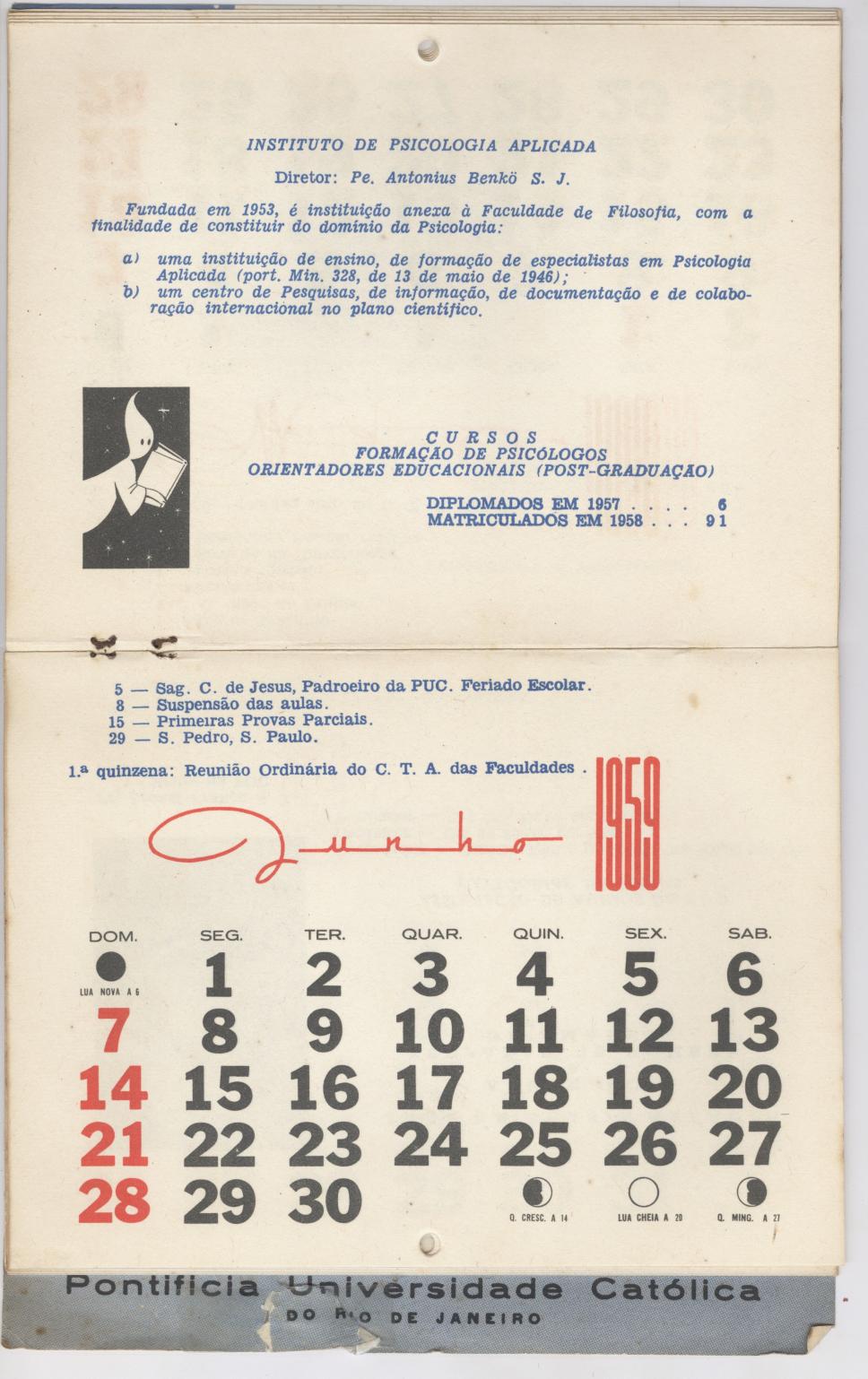 Mês de Junho no Calendário da PUC-Rio referente ao ano de 1959. Contém informações sobre o Instituto de Psicologia Aplicada.