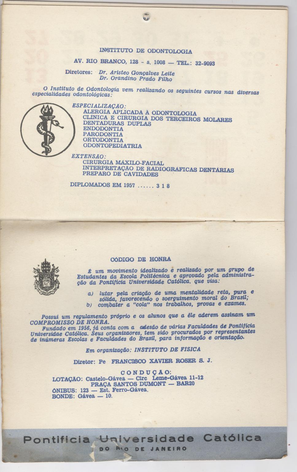 Calendário da PUC-Rio referente ao ano de 1959. Contém informações sobre o Instituto de Odontologia e o Código de Honra da Escola Politécnica.