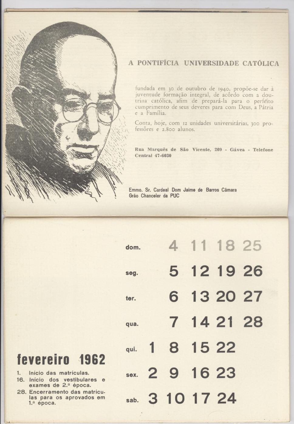 Calendário da PUC-Rio referente ao mês de Fevereiro do ano de 1962. Contém nota sobre a fundação da Universidade e imagem do Grão-Chanceler da PUC-Rio, dom Jaime de Barros Câmara.