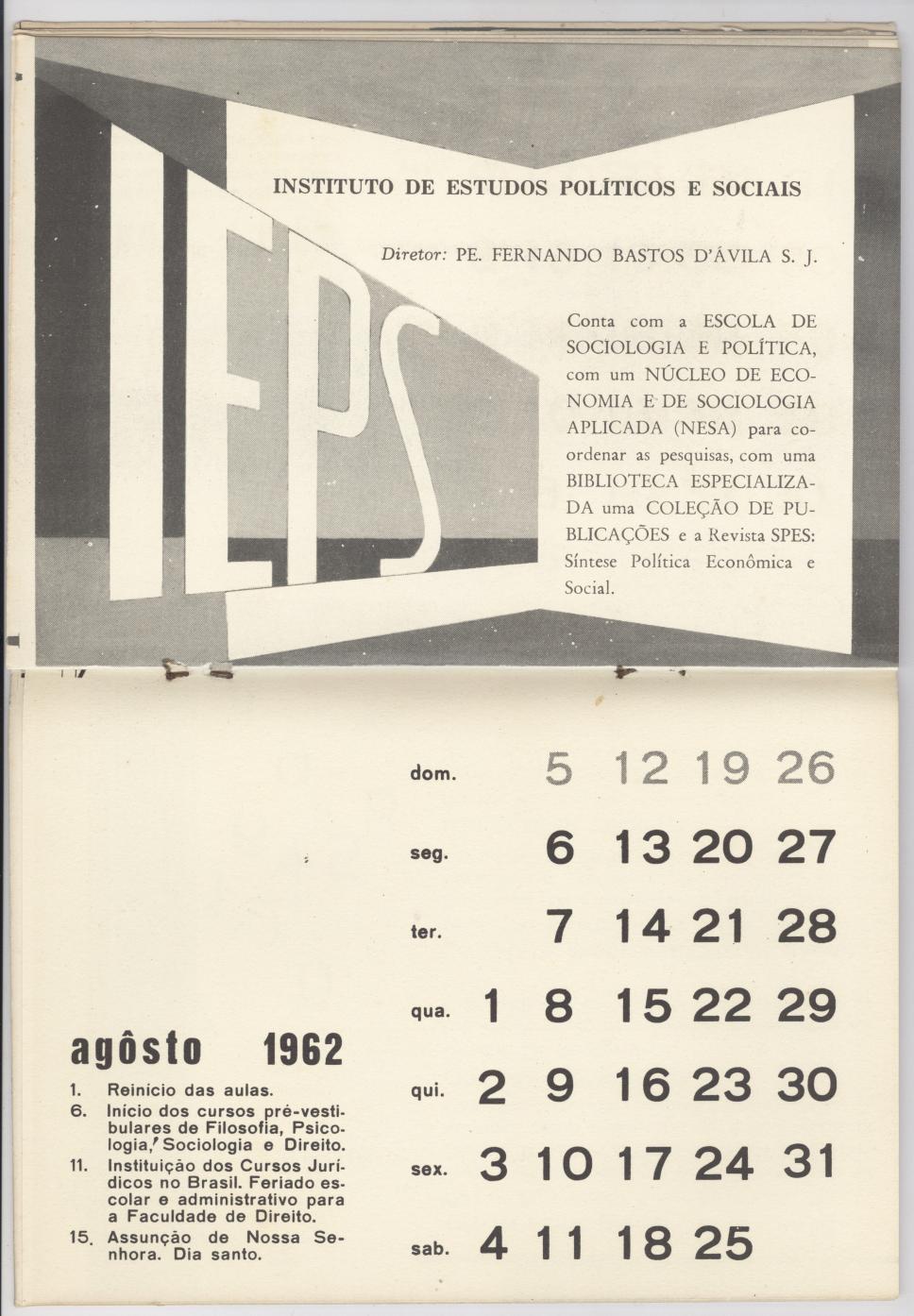 Calendário da PUC-Rio referente ao mês de Agosto do ano de 1962. Contém informações sobre o Instituto de Estudos Políticos e Sociais.