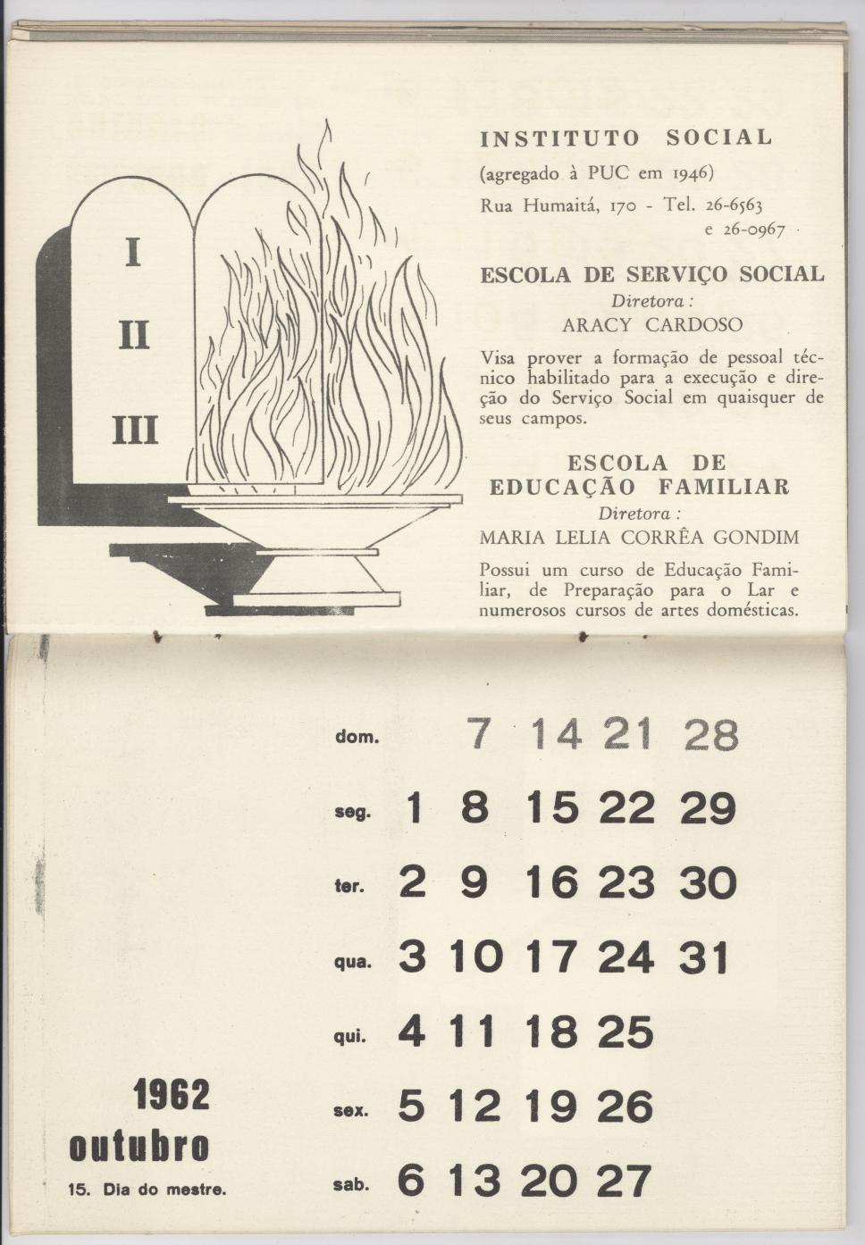 Calendário da PUC-Rio referente ao mês de Outubro do ano de 1962. Contém informações sobre o Instituto Social, Escola de Serviço Social e Escola de Educação Familiar.