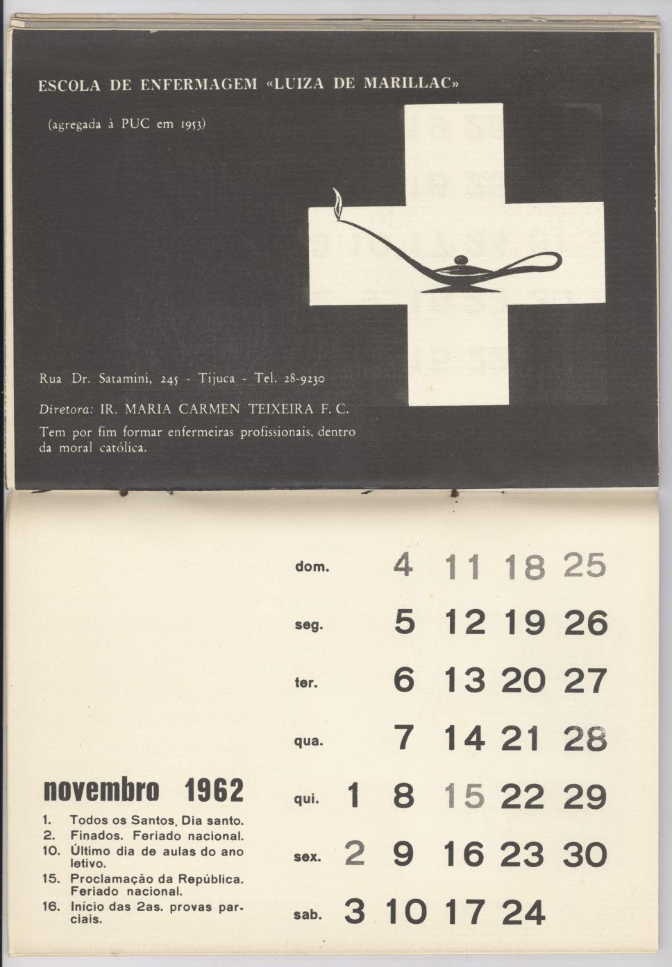 Calendário da PUC-Rio referente ao mês de Novembro do ano de 1962. Contém informações sobre a Escola de Enfermagem Luiza de Marillac, que já fez parte da PUC-Rio.
