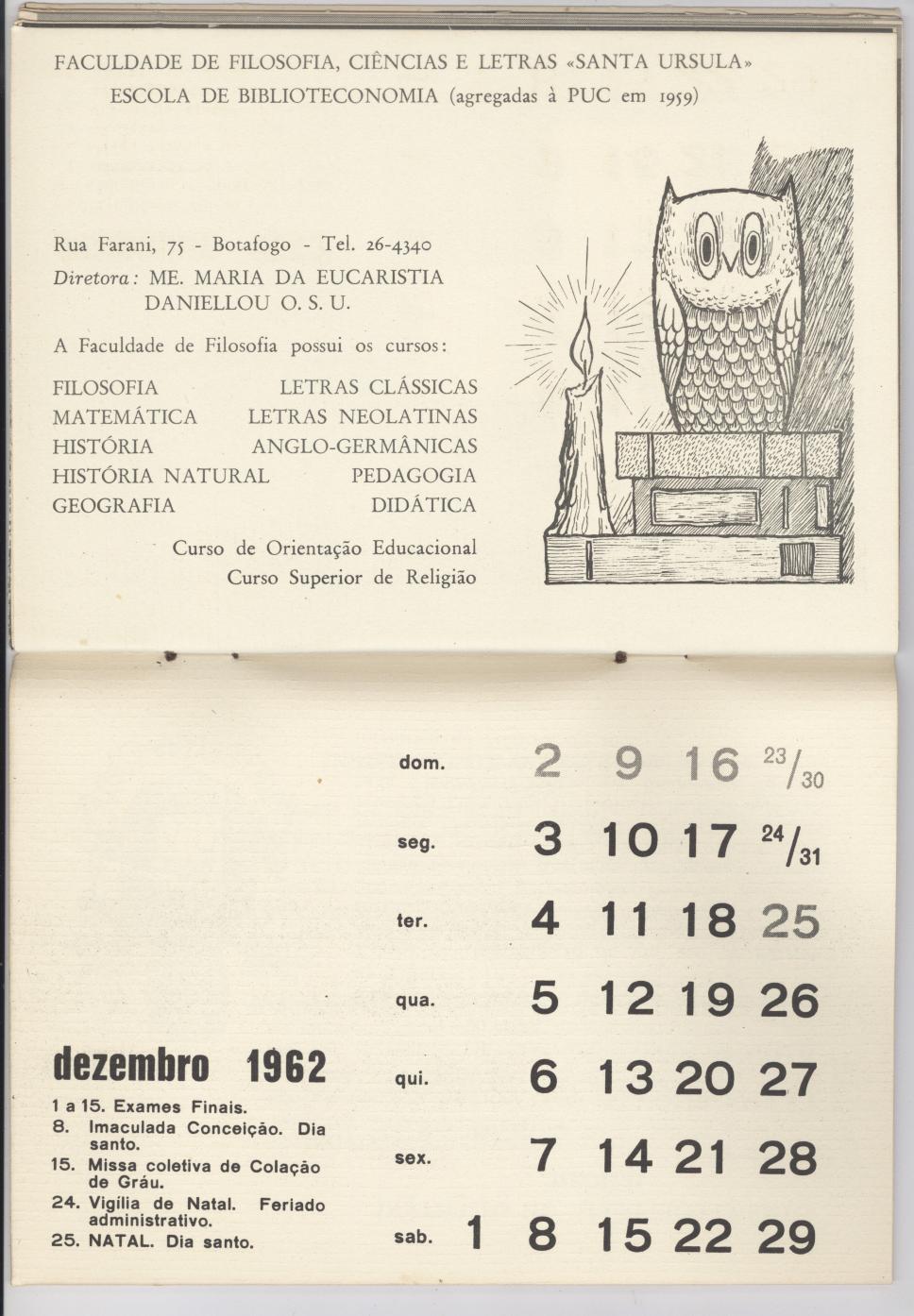 Calendário da PUC-Rio referente ao mês de Dezembro do ano de 1962. Contém informações sobre a Faculdade de Filosofia, Ciências e Letras Santa Úrsula e a Escola de Biblioteconomia, que já fizeram parte da PUC-Rio. Ilustração com uma vela, livros e uma coruja.