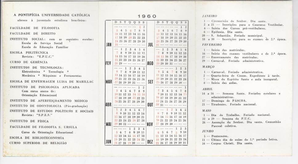 Calendário da PUC-Rio referente ao ano de 1960. Contém uma lista com as faculdades, cursos e institutos que compõem a Universidade, e o calendário acadêmico do primeiro semestre do ano.