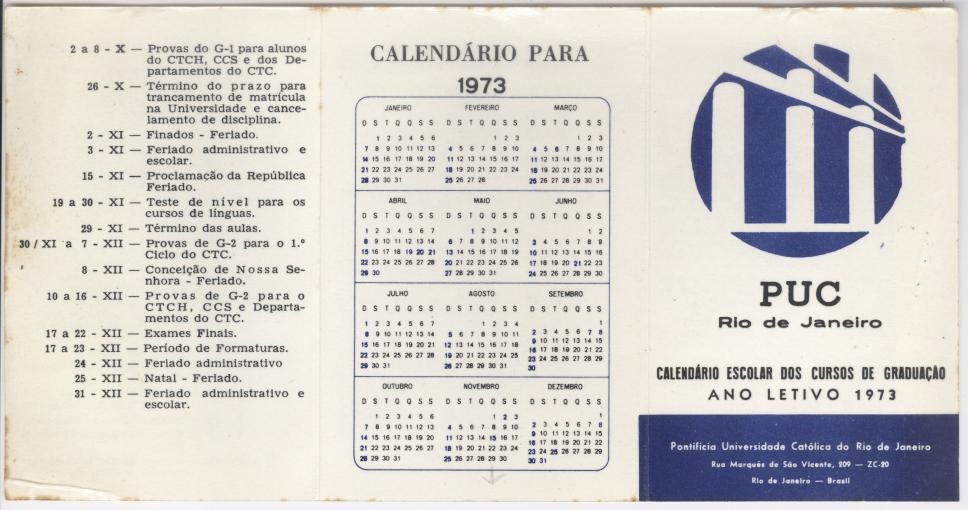 Calendário acadêmico referente ao segundo semestre de 1973 e calendário completo dos meses do ano.