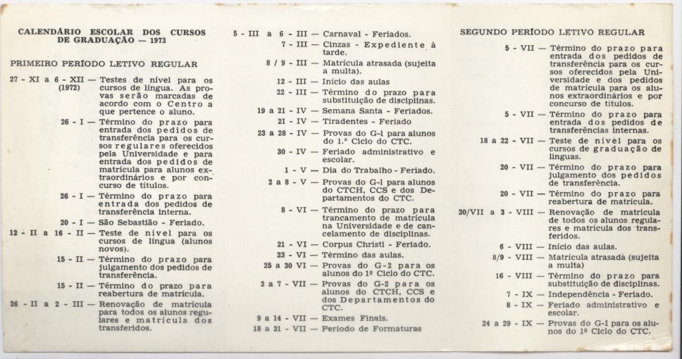 Calendário acadêmico referente ao ano de 1973. "Calendário escolar dos cursos de Graduação".