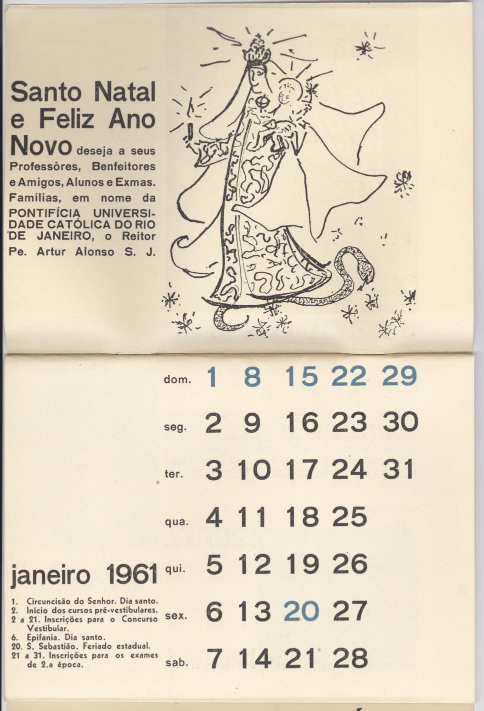 Calendário referente mês de Janeiro de 1961. Contém imagem de Maria com o menino Jesus e mensagem de Natal e Ano Novo. Edição comemorativa do aniversário de 20 anos da Universidade.